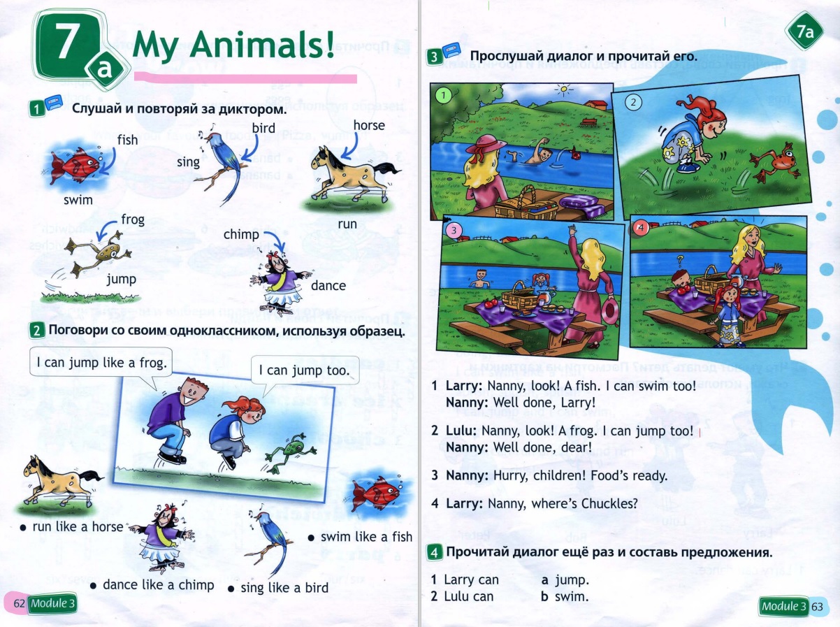 Показывая на изображение рыбки на плакате, учитель говорит: A fish. I can swim too. Он просит детей изобразить действие и повторить I can swim too. Затем, показывая на лягушку, учитель говорит: Look, a frog. I can jump. Дети изображают действие и повторяют I can jump too. Учитель показывает на картинки других животных и просит детей изобразить и назвать действия.